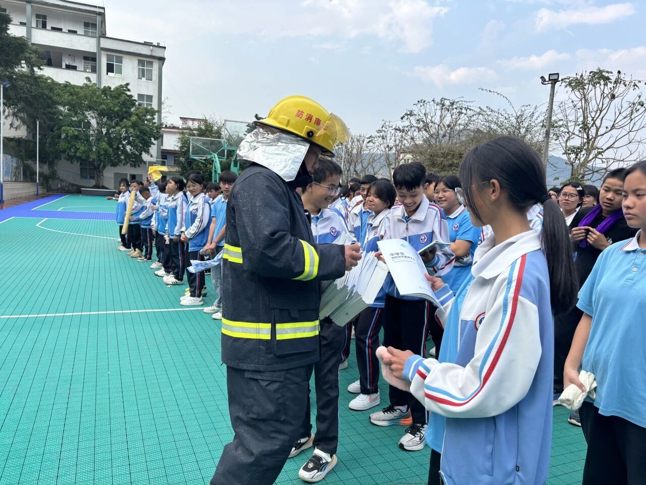 演练结束后,工作人员现场演示灭火器的正确使用方法,并邀请部分师生上台实操扑灭模拟火源。此外,工作人员还向师生发放《中学生消防安全教育手册》,详细讲解火灾危害、预防措施及逃生自救方法等消防知识。