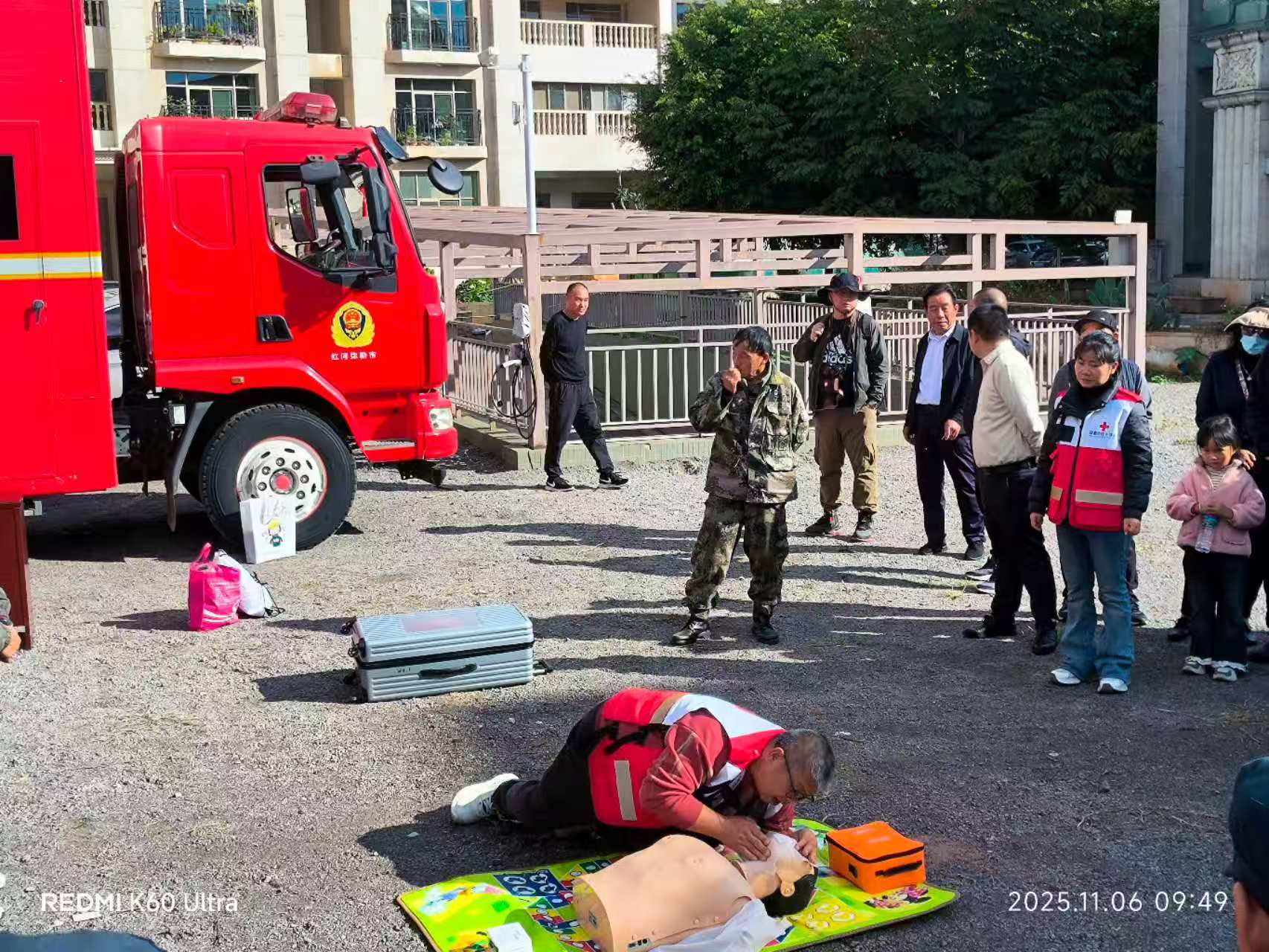 11月6日,弥勒市红十字会联合市消防救援大队、弥勒市地震局、红烟社区开展2025年消防宣传月应急救护知识培训活动,红烟社区、温泉社区、古城社区党员、妇女、青年及辖区居民共计150余人参加了此次活动。
