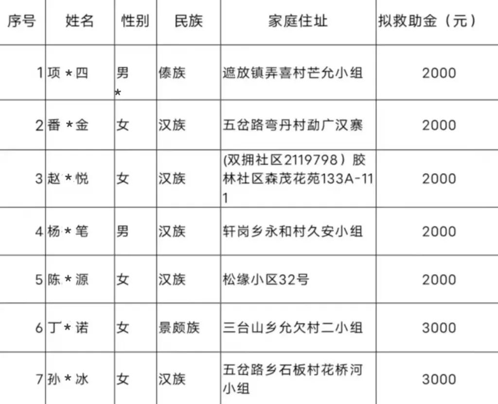 芒市红十字会2023年第二季度拟救助困难家庭名单