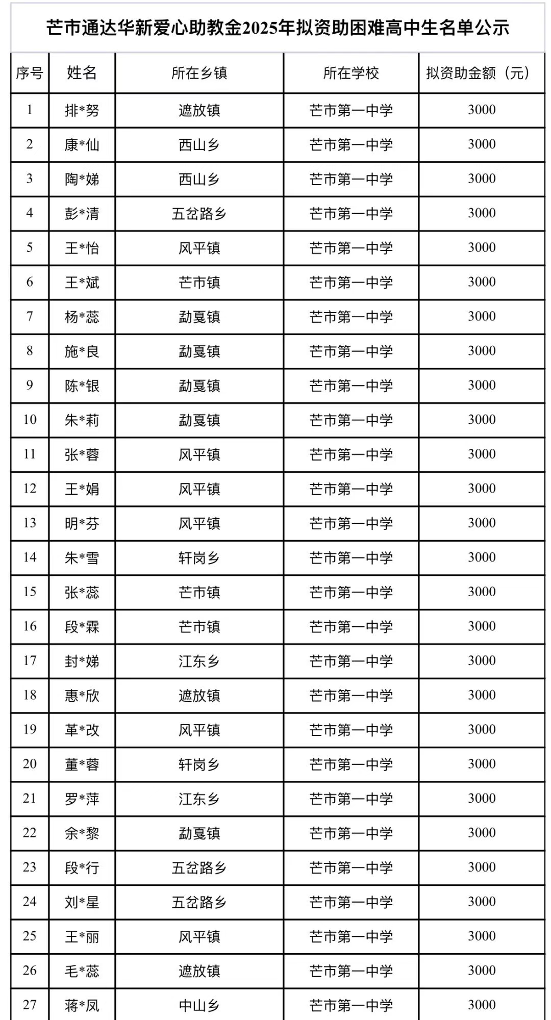 芒市通达华新爱心助教金2025年度拟资助困难高中生名单公示
