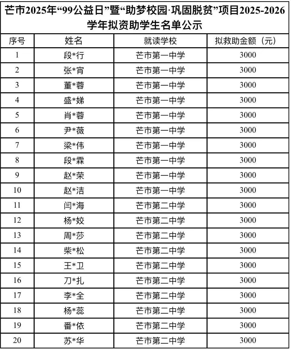芒市2025年“99公益日”暨“助梦校园·巩固脱贫”项目2025-2026学年拟资助困难学生,由困难学生申请、学生家庭所在村委会(社区)及学生所在学校审核,并经芒市“助梦校园·巩固脱贫”项目救助资格审查委员会于2025年12月30日会议审定。现将芒市2025年“99公益日”暨“助梦校园·巩固脱贫”项目2025-2026学年拟救助的20名困难学生名单进行公示。