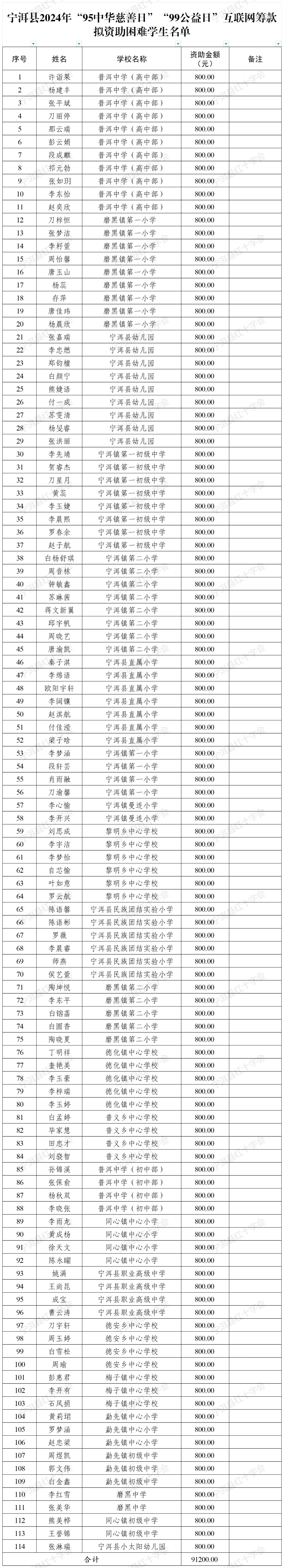 宁洱县2024年“95中华慈善日”“99公益日”互联网筹款拟资助困难学生名单公示