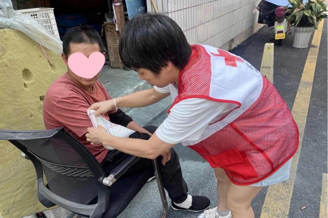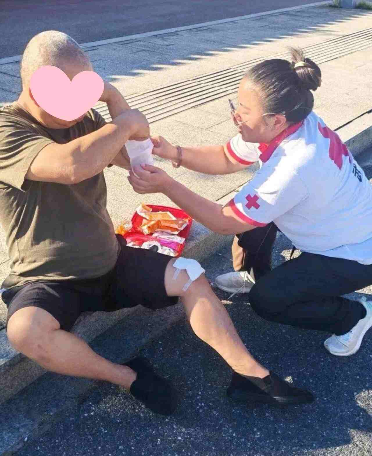 此时,恰巧要去开展应急救护培训的邹晓鹏途经此地,发现伤者坐在路边。她快步上前,询问伤者情况:“有没有受伤?”经检查,发现伤者手臂和膝盖处擦伤,有明显出血。