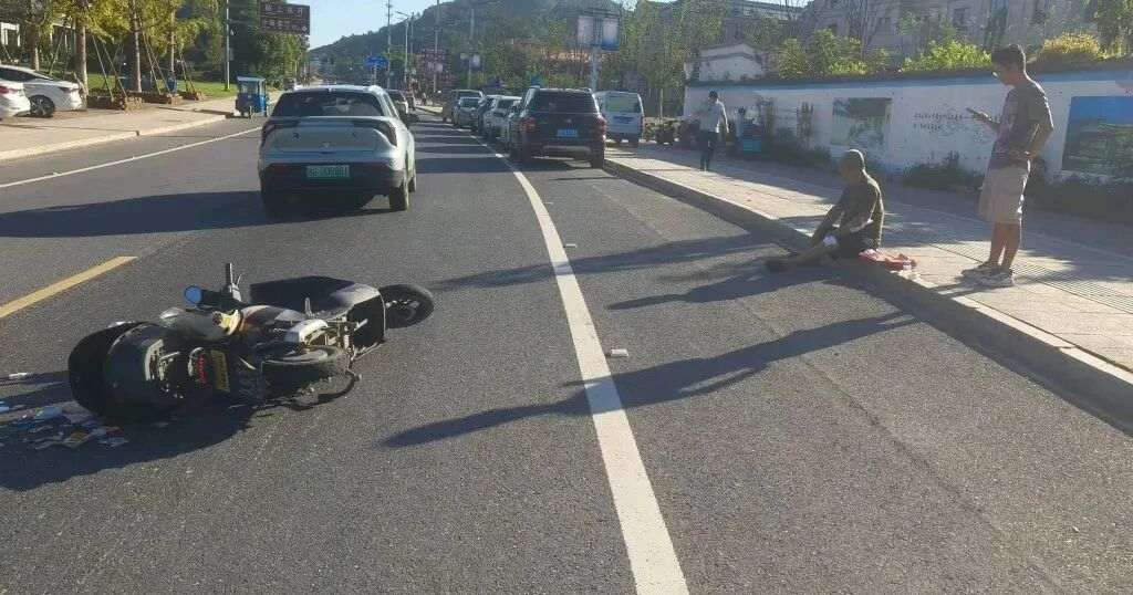 9月16日上午,在武义县武丽线婺州窑遗址公园路段,一辆摩托车与汽车发生碰撞,摩托车驾驶员受伤倒地。