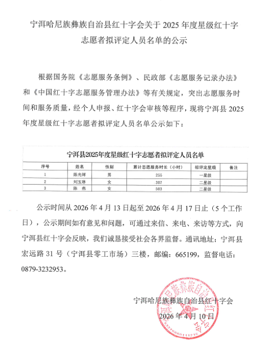 宁洱哈尼族彝族自治县红十字会关于2025年度星级红十字志愿者拟评定人员名单的公示
