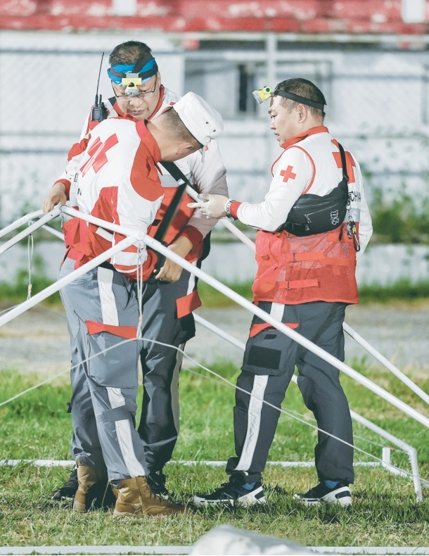 2025年4月6日,楚雄州红十字会救援队员在缅甸曼德勒地震灾区搭建受灾群众安置点。