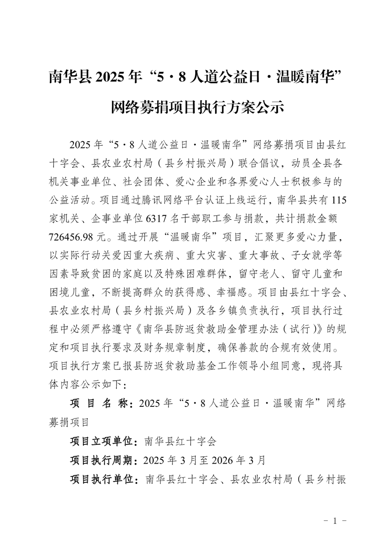 南华县2025年“5·8人道公益日·温暖南华”网络募捐项目执行方案公示