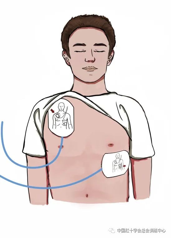 根据AED电极片上的图示,将一片电极片贴在患者裸露胸部的右上方(胸骨右缘,锁骨之下),另一片电极片贴在患者左乳头外侧(左腋前线之后第五肋间处)。