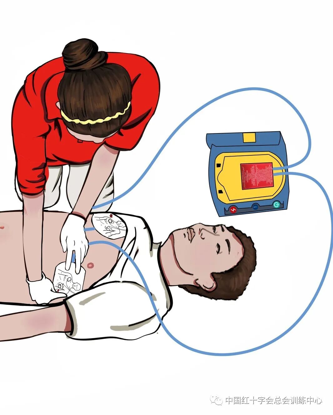注意:如果现场有两名施救者,在一名施救者实施心肺复苏的同时,另一名施救者开始操作AED,不能因为贴电极片而中断心肺复苏。