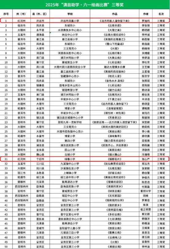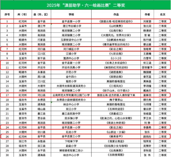 近日,由云南省红十字会主办的以“旅居云南——远方的客人请你留下来”为主题的2025年“滇苗助学六一绘画比赛”评选结果揭晓。我州上报的参赛作品成绩亮眼,斩获一等奖4名、二等奖7名、三等奖2名。