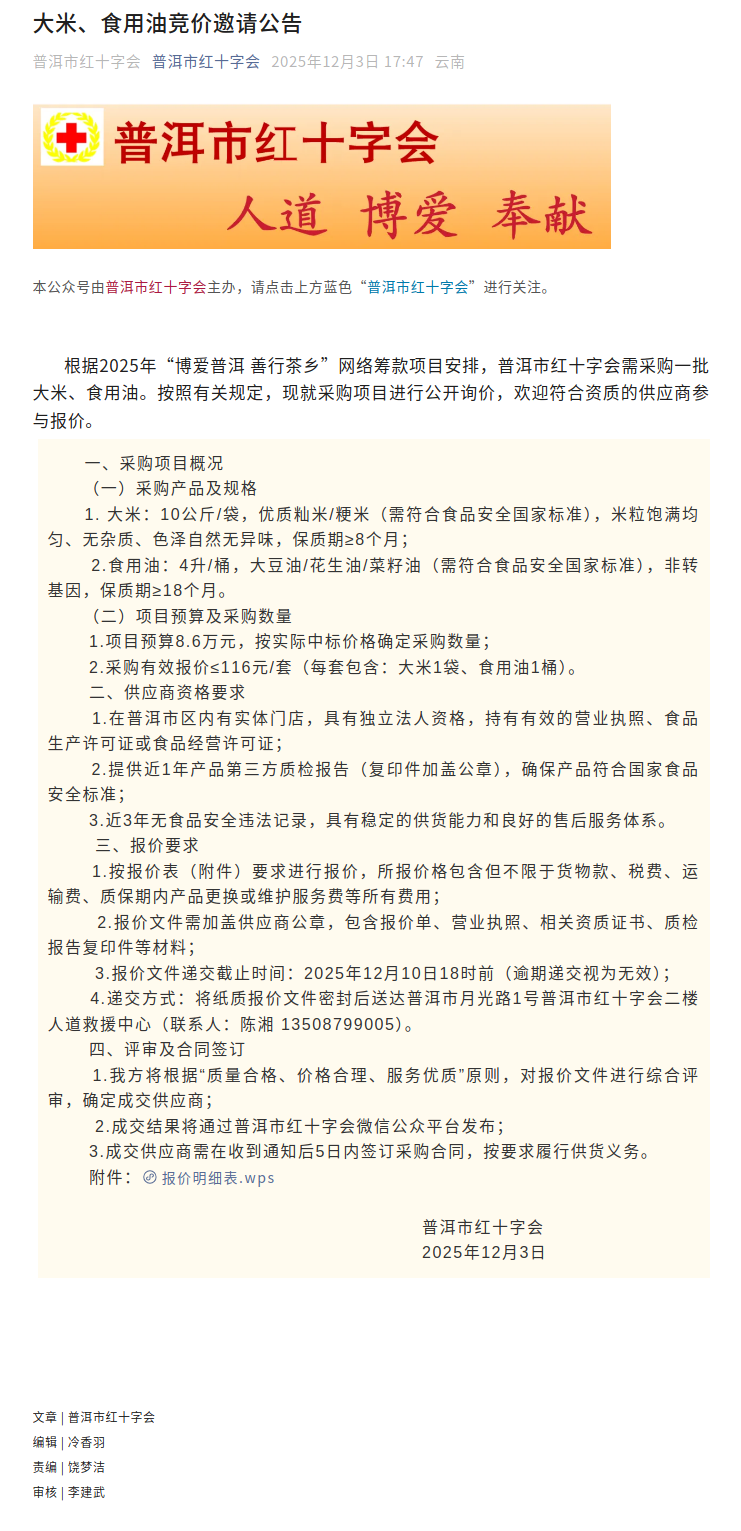 普洱市红十字会2025年“博爱普洱 善行茶乡”网络筹款项目大米、食用油采购竞价公示