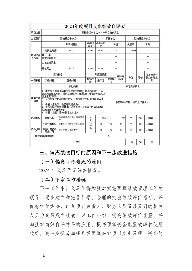 双柏县红十字会2024年度部门整体支出绩效自评、项目支出绩效自评表