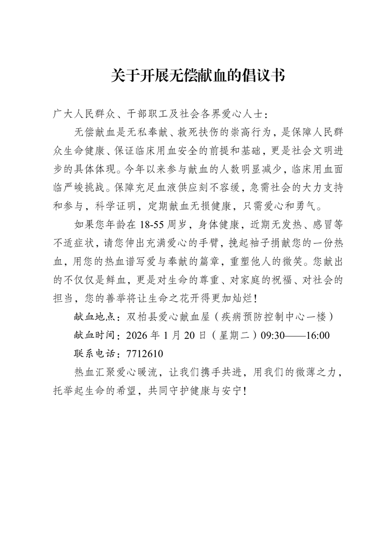 关于开展无偿献血的倡议书