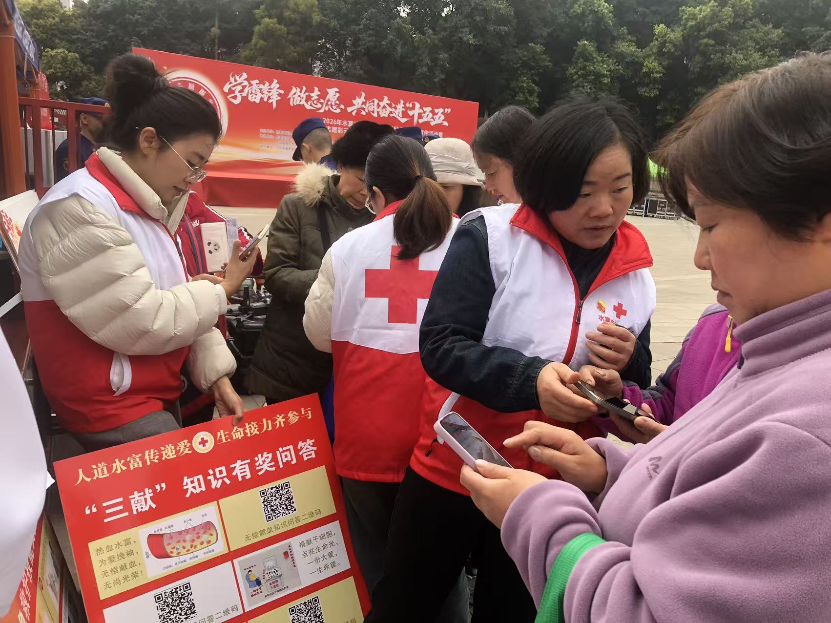 3月5日学雷锋纪念日当天,水富市红十字会积极响应号召,踊跃参加“学雷锋做志愿共同奋进‘十五五’”主题宣传活动。 活动现场,市红十字“三献”志愿服务队在春晖广场精心布置了宣传区域,通过知识问答、现场登记等丰富多样的形式,向市民们全面普及无偿献血、造血干细胞捐献、人体器官捐献知识。志愿者们耐心细致地讲解,市民们认真聆听,不时提出疑问,现场互动氛围热烈。