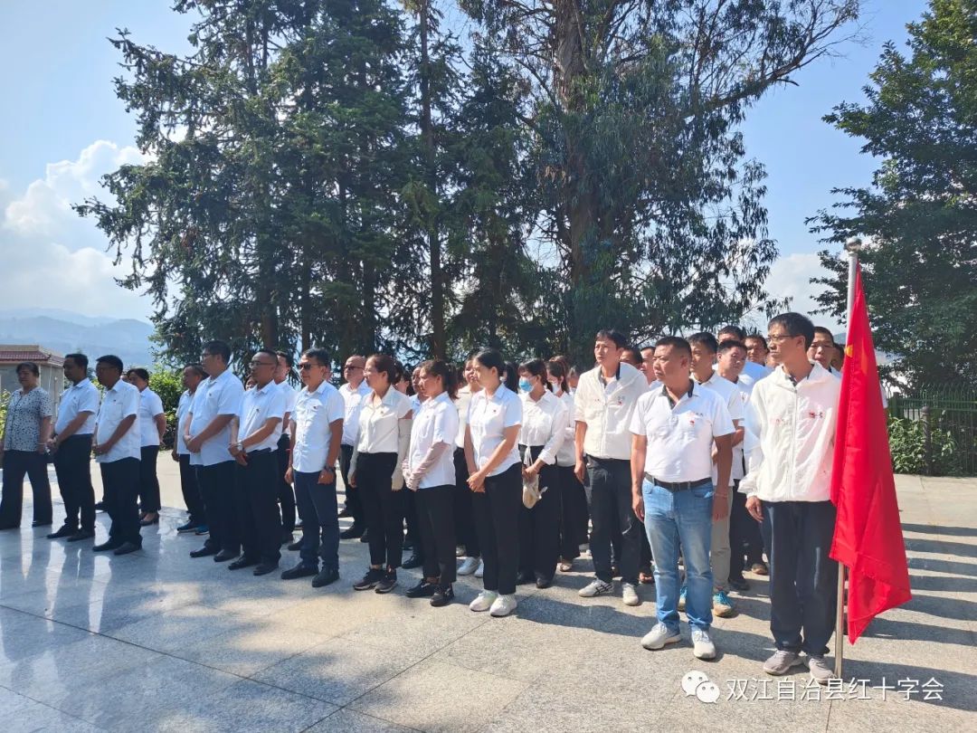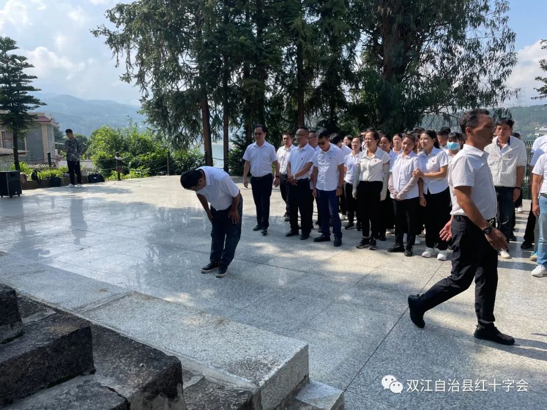 “我志愿加入中国共产党,拥护党的纲领……随时准备为党和人民牺牲一切,永不叛党。”面向党旗,双江自治县红十字会全体党员怀着崇敬的心情瞻仰烈士英名和英雄事迹,默哀致礼,在深切缅怀中感受先烈们的革命意志和不朽精神。在临沧市博尚烈士陵园前大家举起右拳,重温入党誓词,铿锵有力,激荡胸怀。