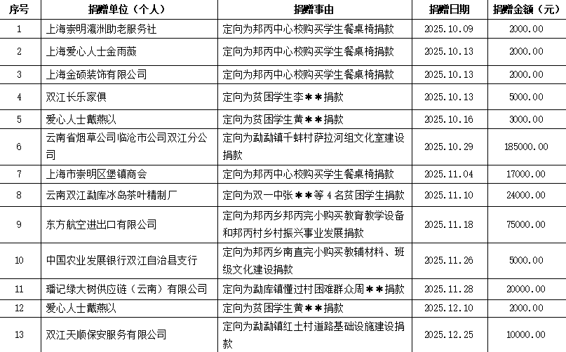 双江自治县红十字会是党领导下的群团组织,是从事人道主义工作的社会救助团体,是党和政府在人道领域的助手和联系群众的桥梁纽带,开展社会募捐和救助是《中华人民共和国红十字会法》赋予的法定职责。现将双江自治县红十字会2025年10-12月社会捐赠资金、物资接收和使用情况公示如下: