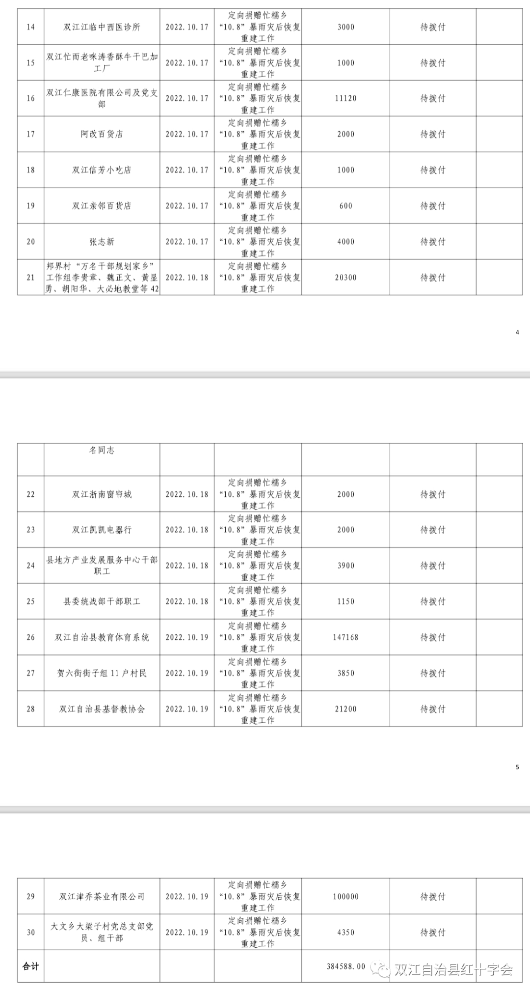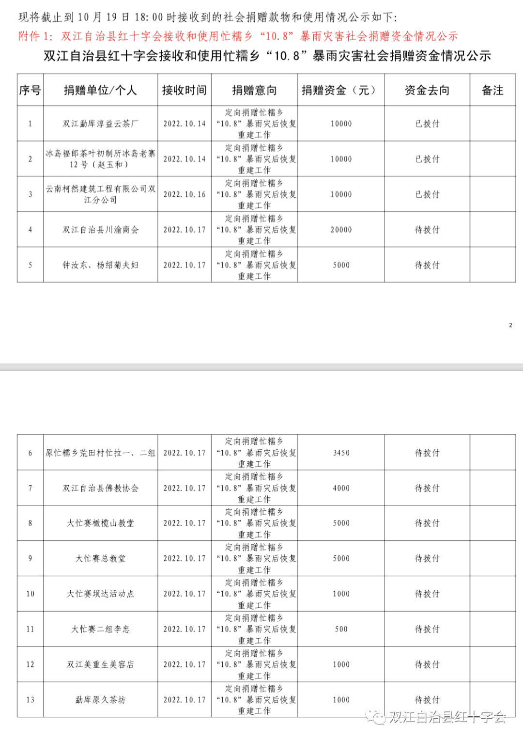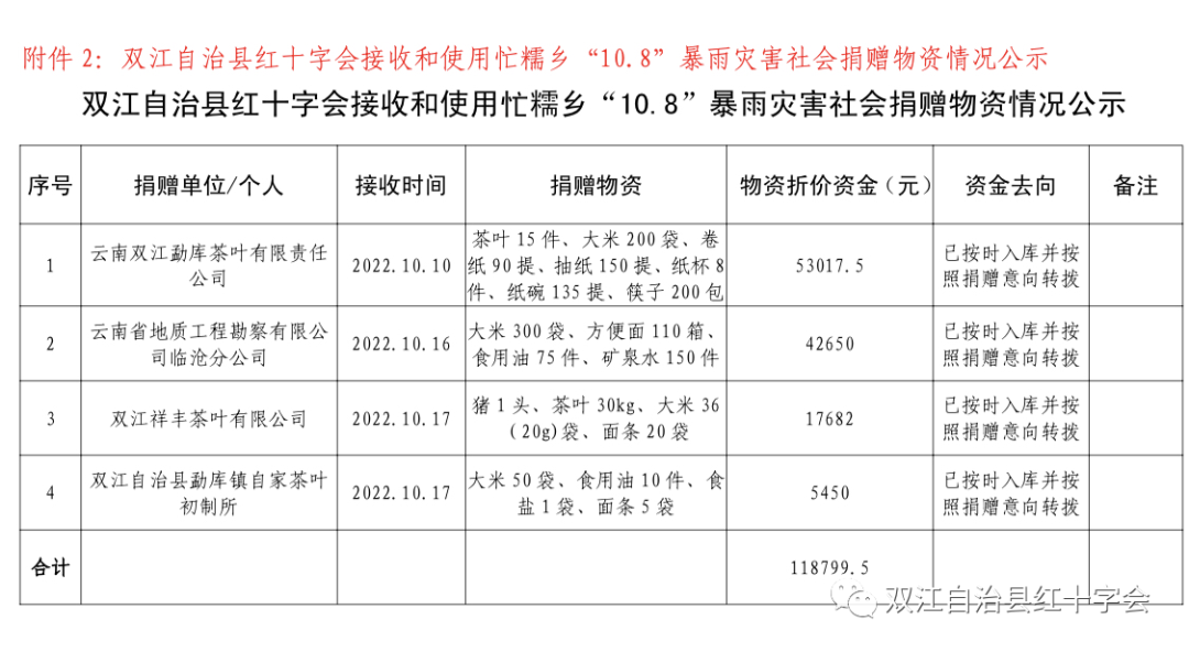 双江自治县红十字会接受和使用关于忙糯乡“10·8”暴雨灾害社会捐赠情况公示第四期