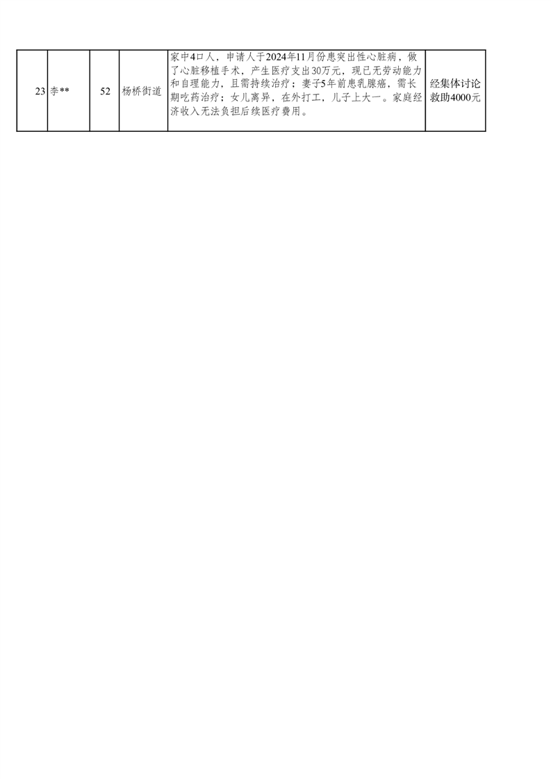 2025年12月23日,县红十字会组织召开第二十次人道救助基金审核监督委员会会议,对近期23户困境家庭申请救助人员相关事宜进行审核讨论。根据《嵩明县人道救助基金管理办法》,经会议讨论,决定拟对唐**、李**、沐**、杨**每人救助5000元;王**、李**、秦**、赵**、李**、施**每人救助4000元;张*、李*、薄**、郭**每人救助3000元,张**、杨**、林*、邹**、朱**、沈**、张**、李**每人救助2000元,普**达不到救助标准,不予救助。此次共救助符合条件人员22户,金额共计72000元。