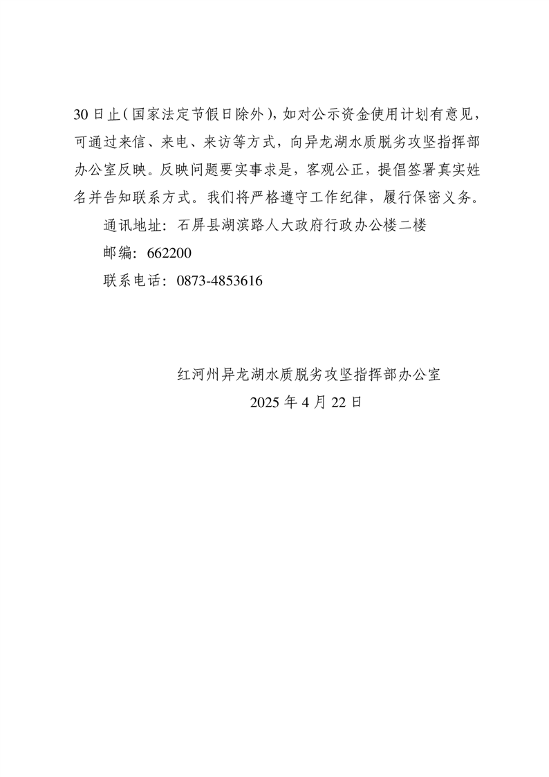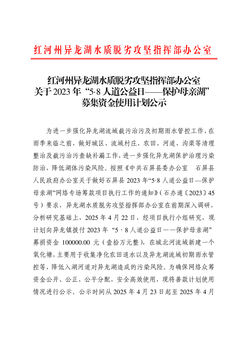 红河州异龙湖水质脱劣攻坚指挥部办公室关于2023年“5·8人道公益日——保护母亲湖”募集资金使用计划公示