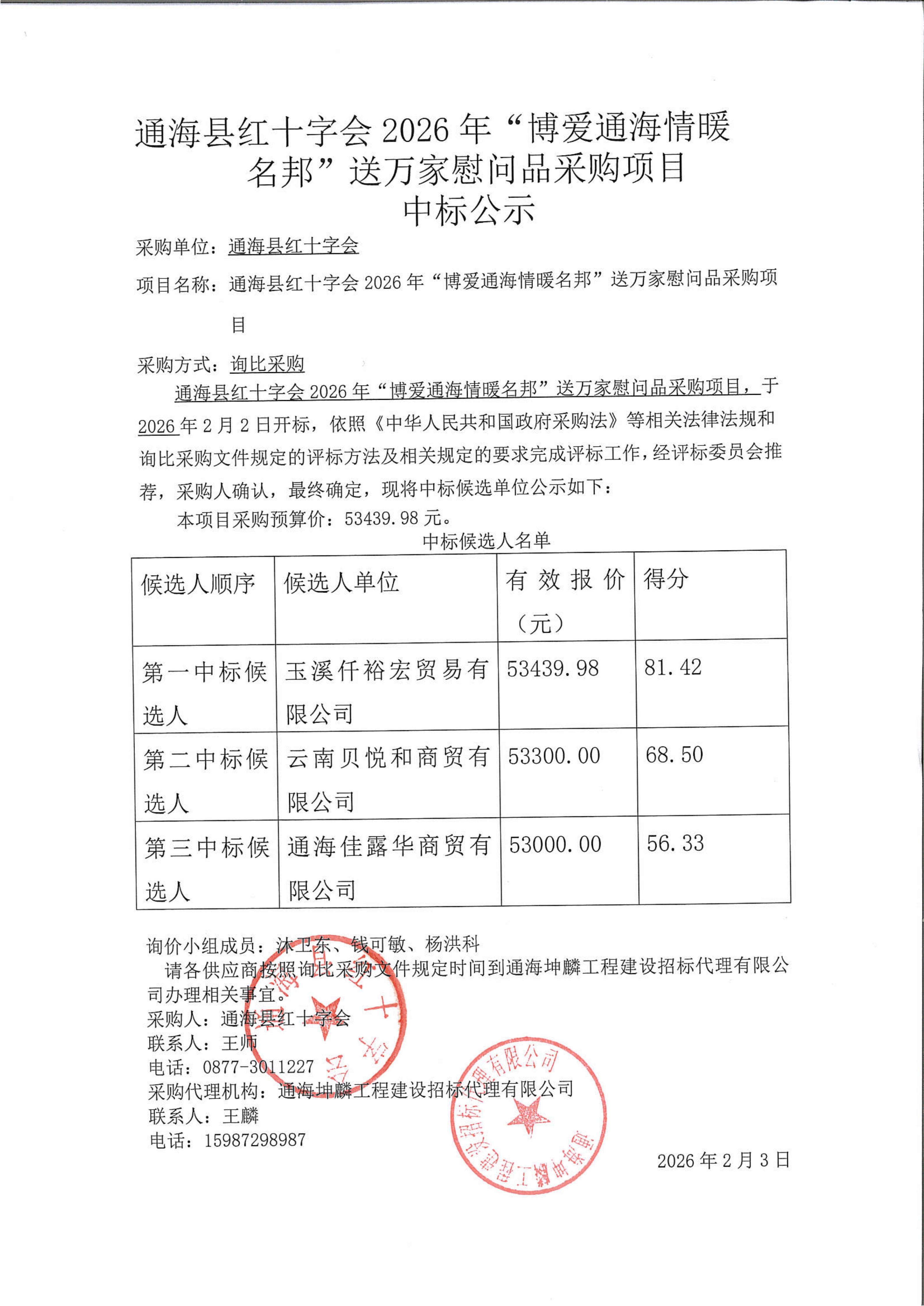 通海县红十字会2026年“博爱通海情暖名邦”送万家慰问品采购项目中标公示