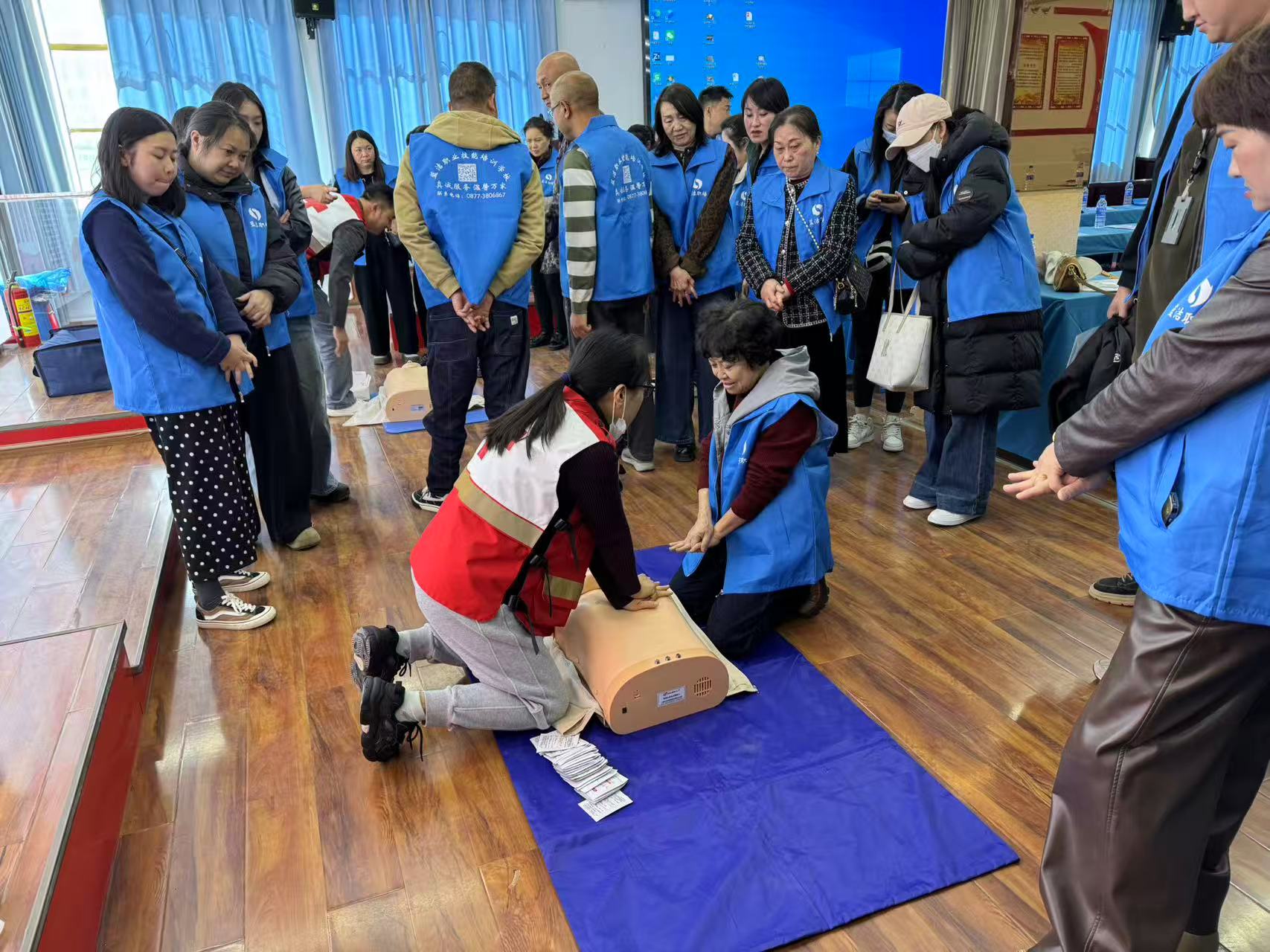 培训紧扣一线工作场景实际需求,采用理论讲解、视频教学、实操演练相结合的模式,重点讲授了心肺复苏(CPR)、气道异物梗阻急救等实用技能。授课过程中,讲师通过标准动作示范、现场视频演示及手把手实操指导,帮助参训人员快速掌握核心救护技能,有效提升了大家应对突发状况的自救互救能力和安全防范意识。
