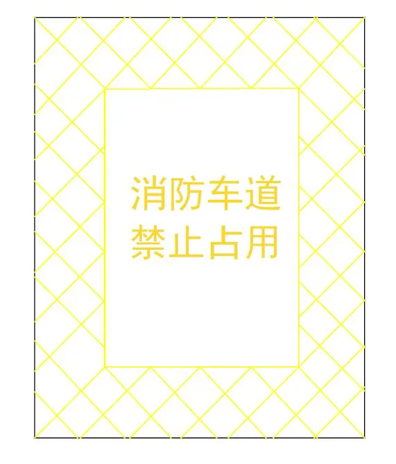 2.在单位或者住宅区的消防车通道出入口路面,按照消防车通道净宽施划禁停标线,标线为黄色网状实线,外边框线宽20厘米,内部网格线宽10厘米,内部网格线与外边框夹角45度,标线中央位置沿行车方向标注内容为“消防车道 禁止占用”的警示字样(示例见下);同时在消防车通道两侧设置醒目的警示标牌(示例见下),提示严禁占用消防车道,违者将承担相应法律责任等内容。