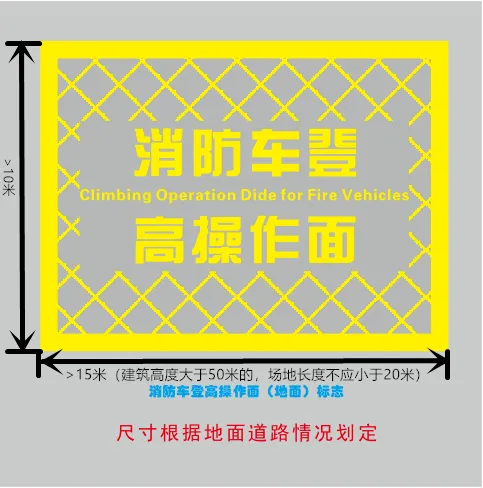 3.消防车登高操作场地应根据建筑防火设计确定,并根据场地实际大小施划禁停标线(长不小于15米、宽不小于10米),标线为黄色网状实线,外边框线宽20厘米,内部网格线宽10厘米,内部网格线与外边框夹角45度,标线中央位置标注内容为“消防车登高操作面”的警示字样(示例见下)。
