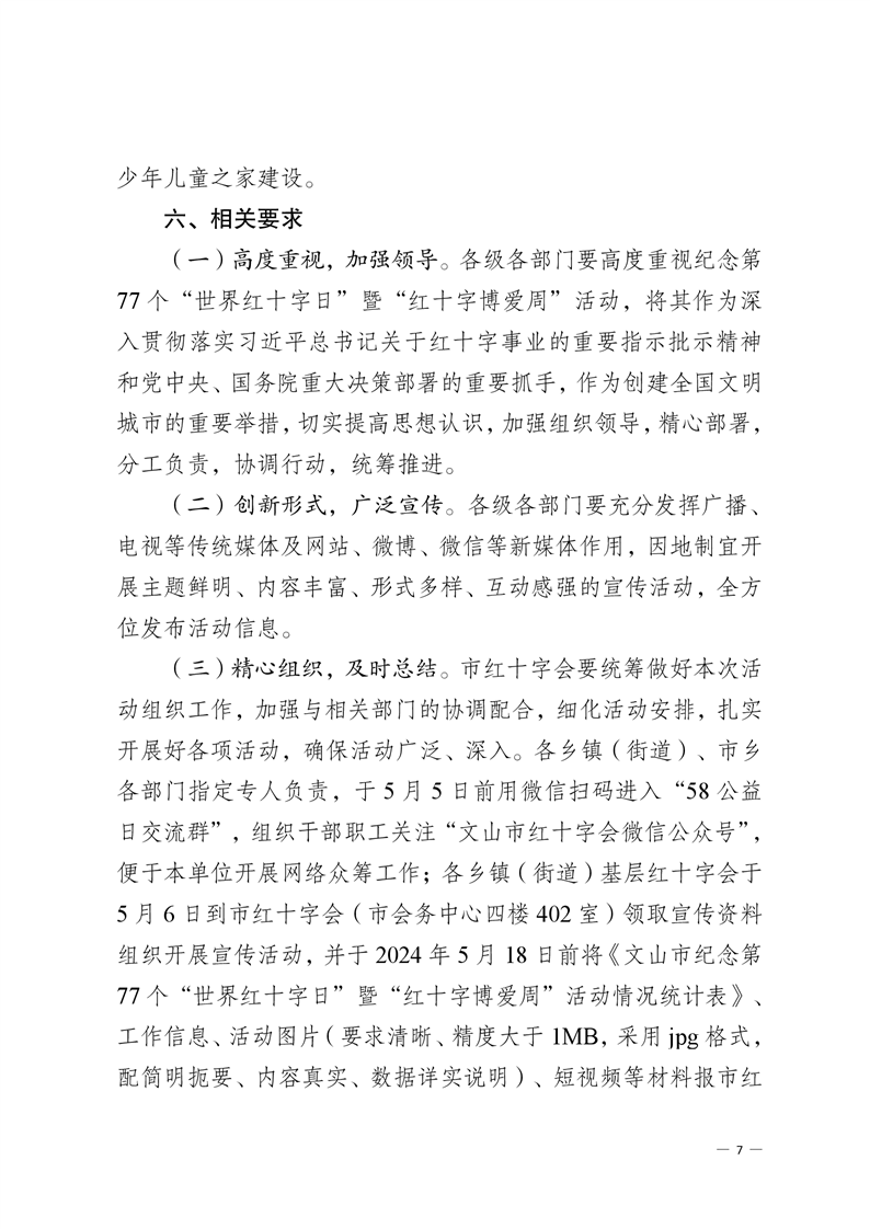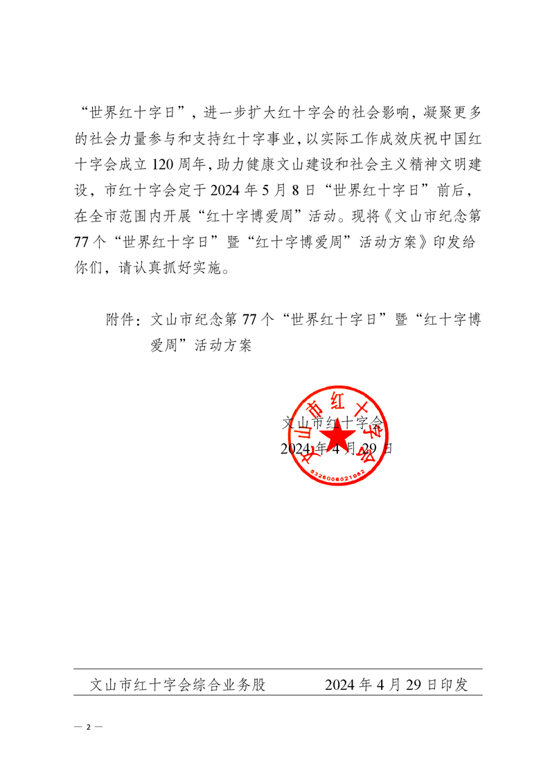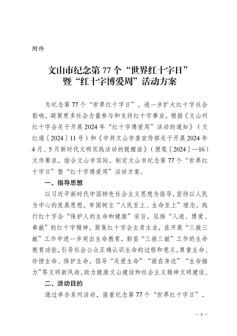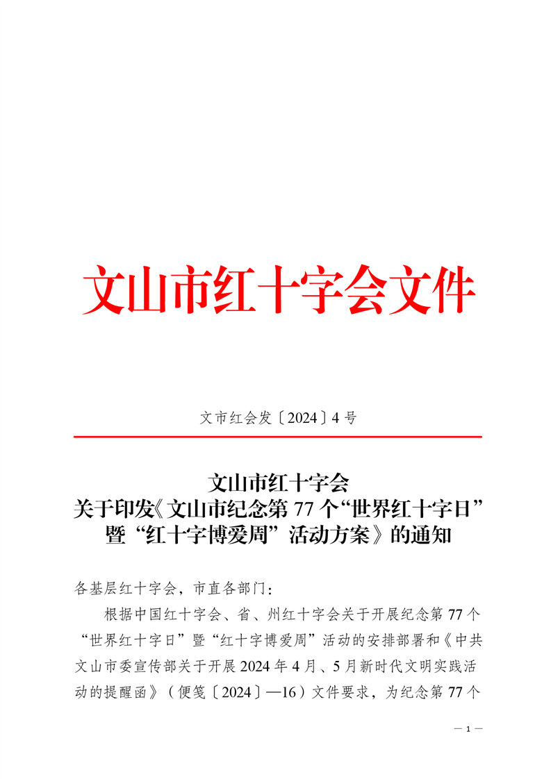 文山市红十字会 关于印发《文山市纪念第 77 个“世界红十字日” 暨“红十字博爱周”活动方案》的通知