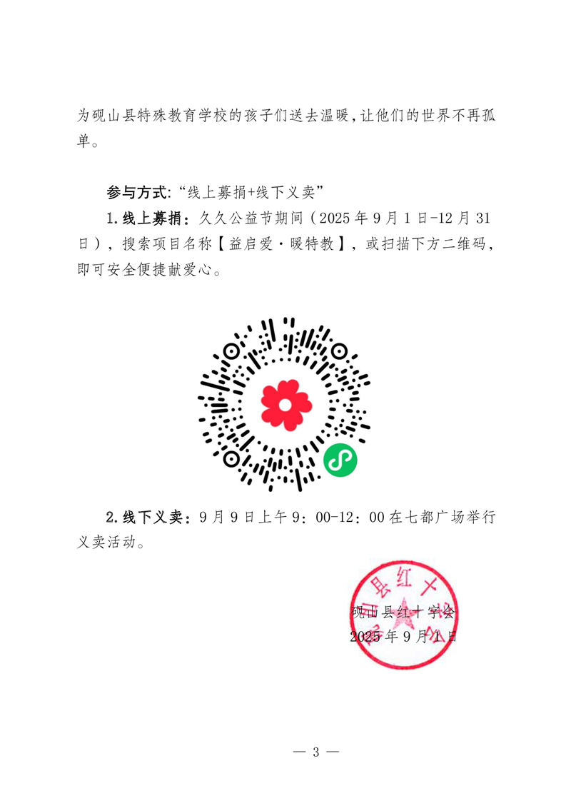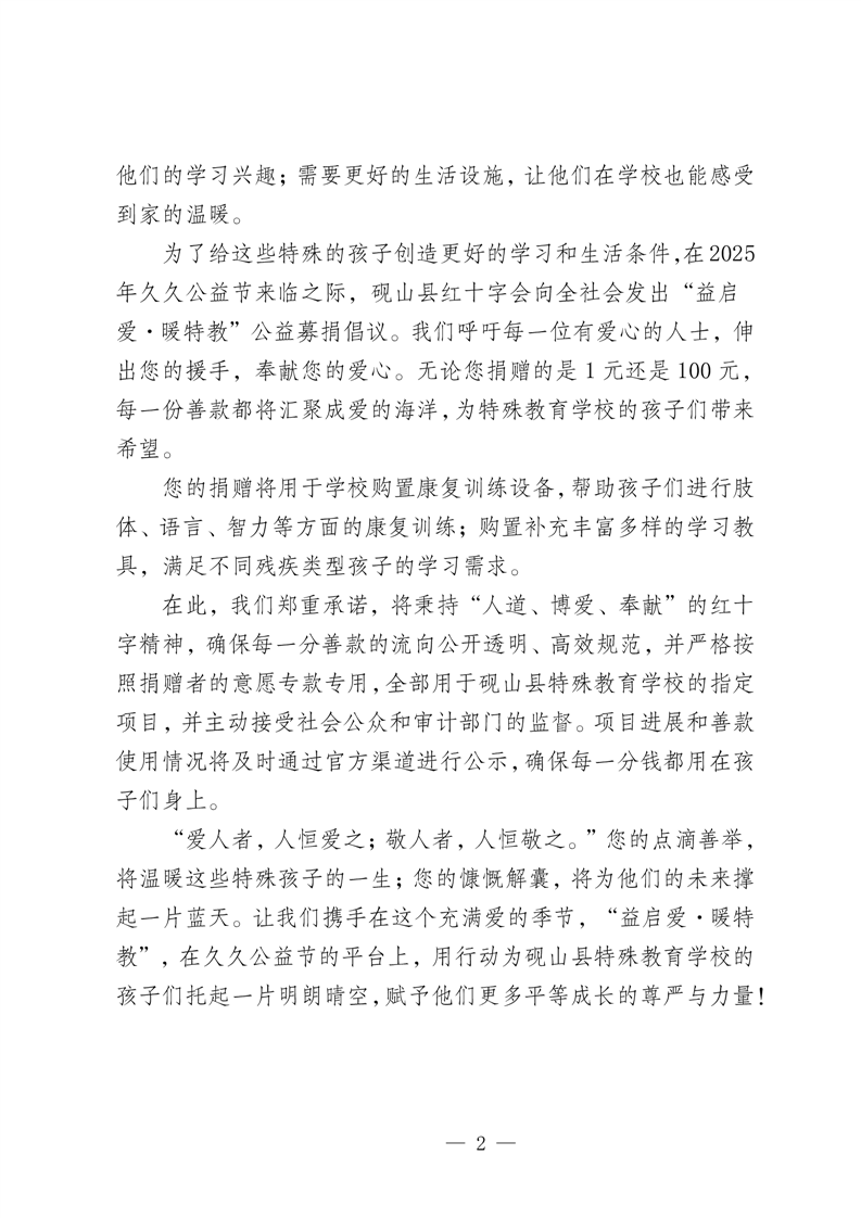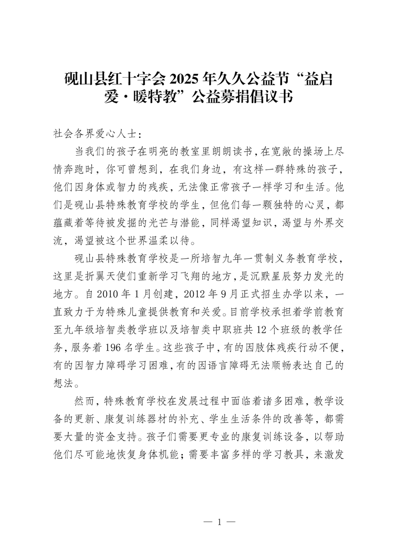 砚山县红十字会2025年久久公益节“益启爱·暖特教”公益募捐倡议书