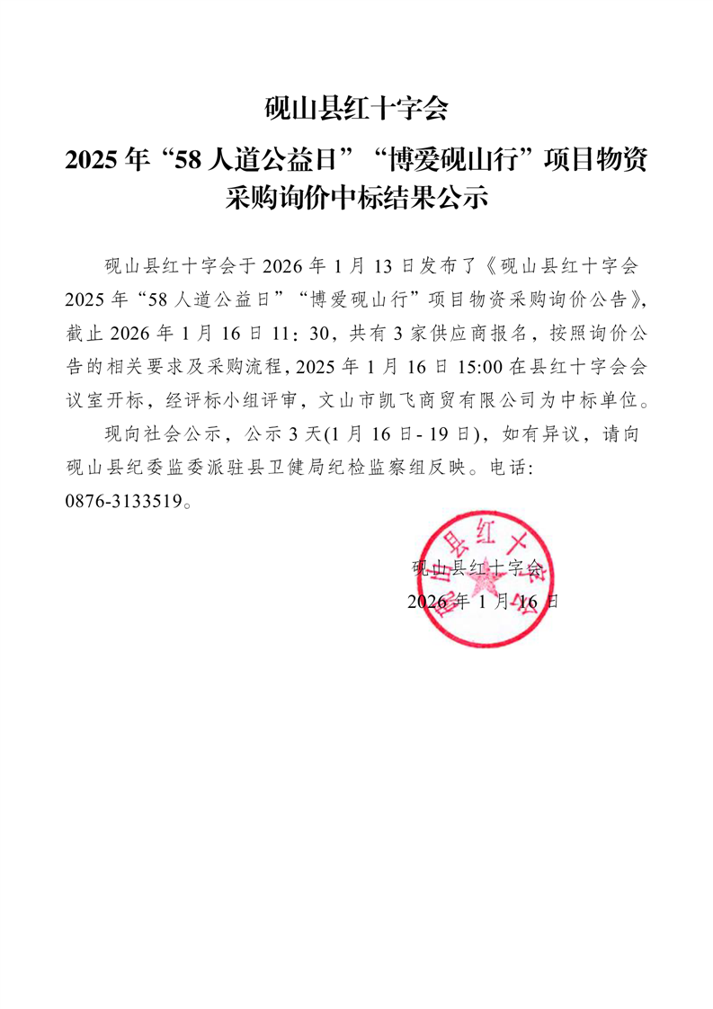 砚山县红十字会2025年“58人道公益日”“博爱砚山行”项目物资采购询价中标公示