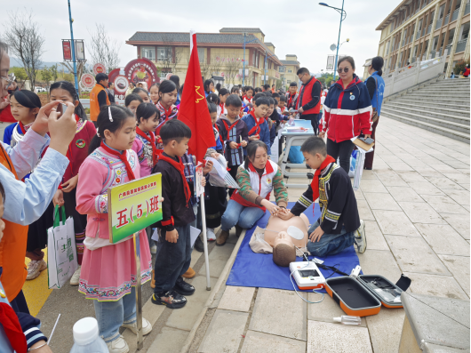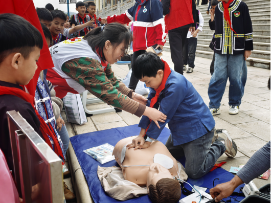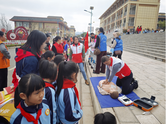 活动现场,身着红马甲的红十字志愿者们在莲城镇民族小学设立便民服务台,将应急救护技能普及作为活动重点宣传到1500余名学生身边。志愿者们用通俗易懂的语言,细致讲解心肺复苏+AED操作要点,借助人体模型分步演示急救流程,手把手指导现场群众与学生实操练习,耐心解答日常突发状况中的急救疑问,确保大家听得懂、学得会、用得上,真正掌握实用“救命本领”,进一步提升群众自我防护和应急处置能力。