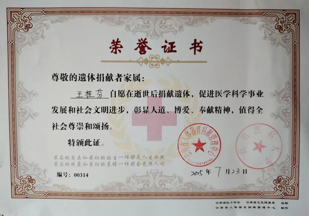 7月22日,57岁的中共党员王桂芬女士在曲靖市因病不幸逝世。秉承其生前坚定意愿,她的遗体被无偿捐献给医学事业,成为曲靖市第29例遗体捐献者。