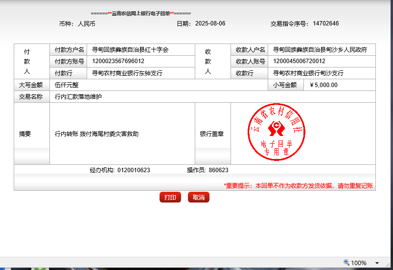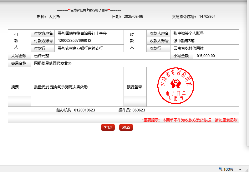对5户困难家庭的救助资金,由农户填写困难救助申请表,县红十字会直接转账至困难农户银行卡。