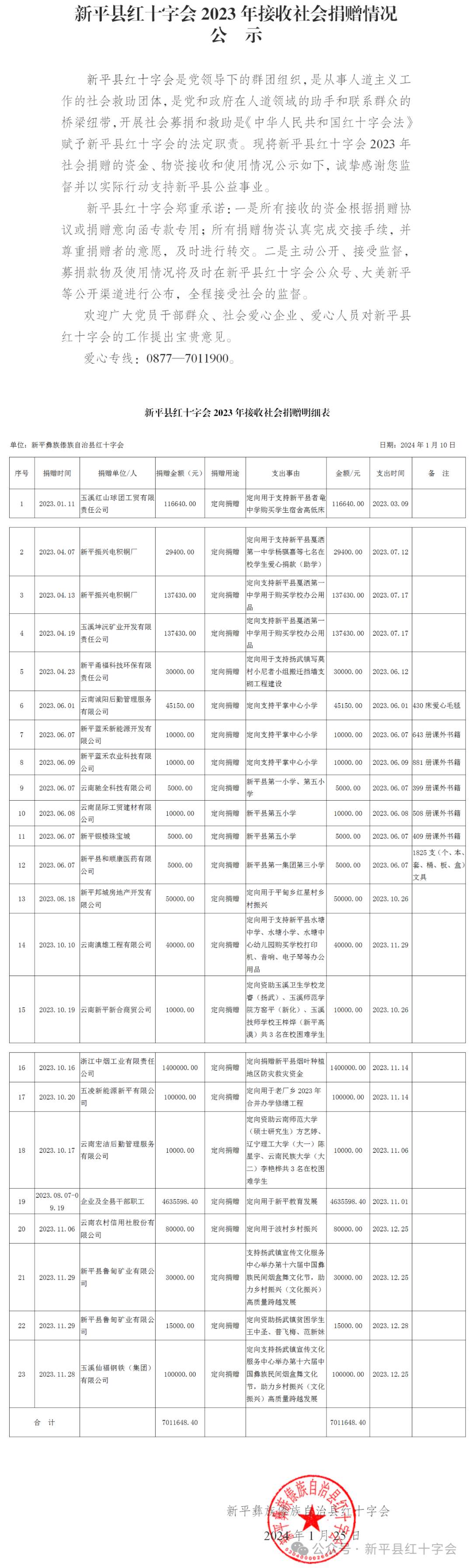 新平县红十字会2023年接收社会捐赠情况公示