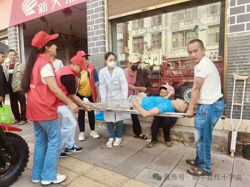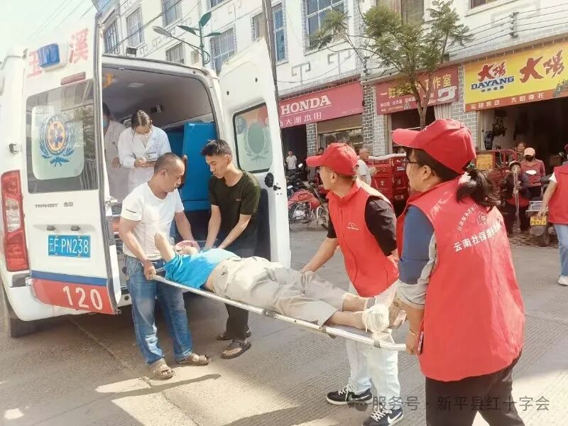 “您别慌!我们是乡红十字会成员!”工作人员一边安抚家属情绪,一边半跪在地检查老人呼吸、脉搏情况,同时指挥同事分工协作,让人立即联系乡卫生院启动应急通道,并到路口等待救护车,联系社区通过信息台账快速联系到老人其他家属并告知现场情况,疏散围观群众为老人搭建出阴凉通风的急救空间。6分钟后,伴随着急促的鸣笛声,乡卫生院的救护车穿越赶集人群抵达现场。工作人员与医护人员默契配合,利用专业担架稳稳将老人转移至车内,并协助安排家属陪同就医。同时,持续与卫生院保持联系跟进治疗情况。目前,初步诊断考虑为脑血管疾病,患者已转至新平县医院就医。