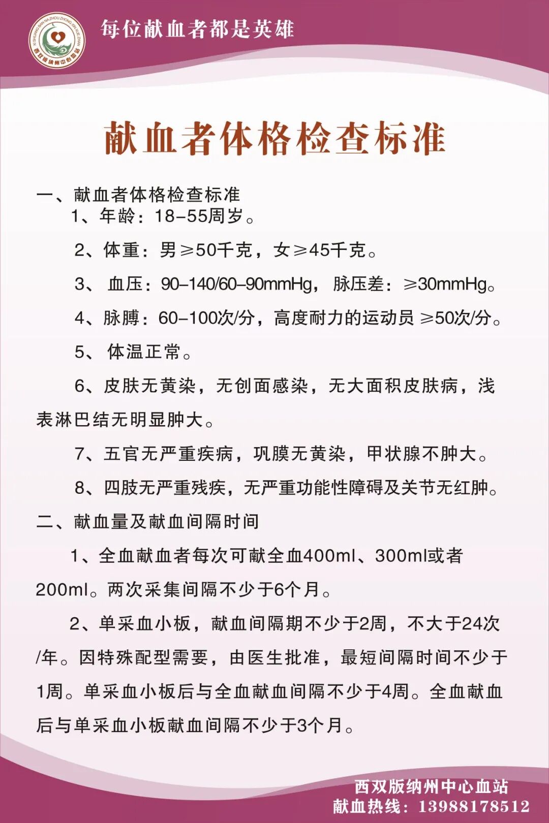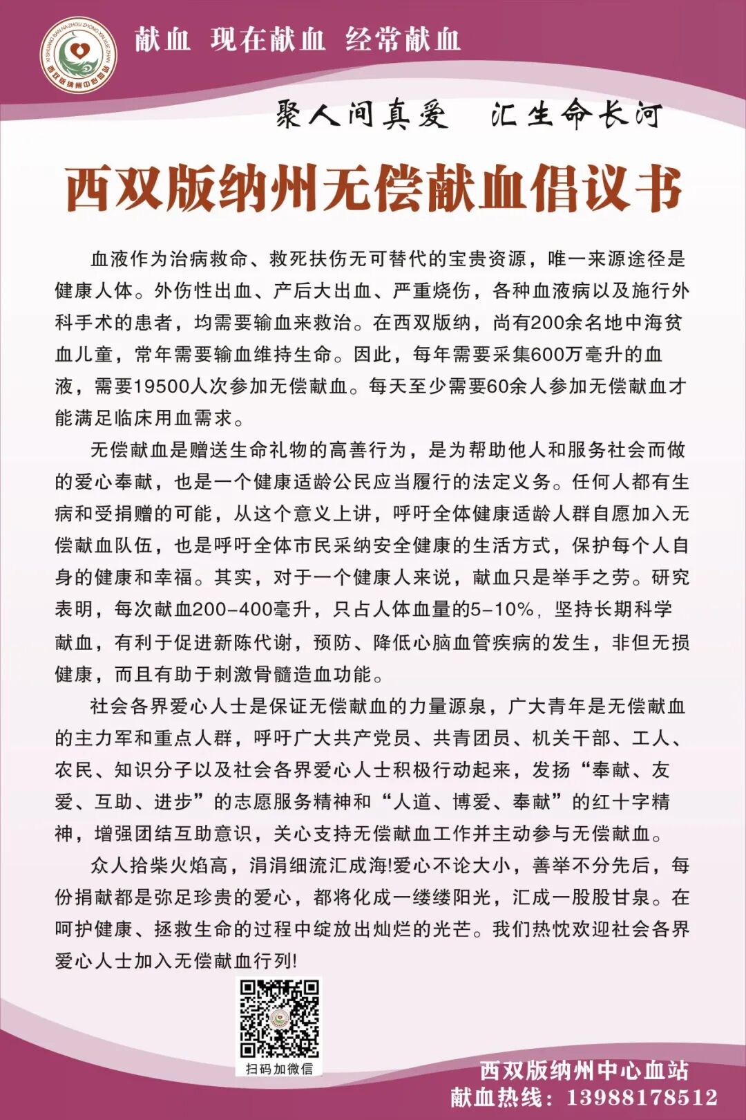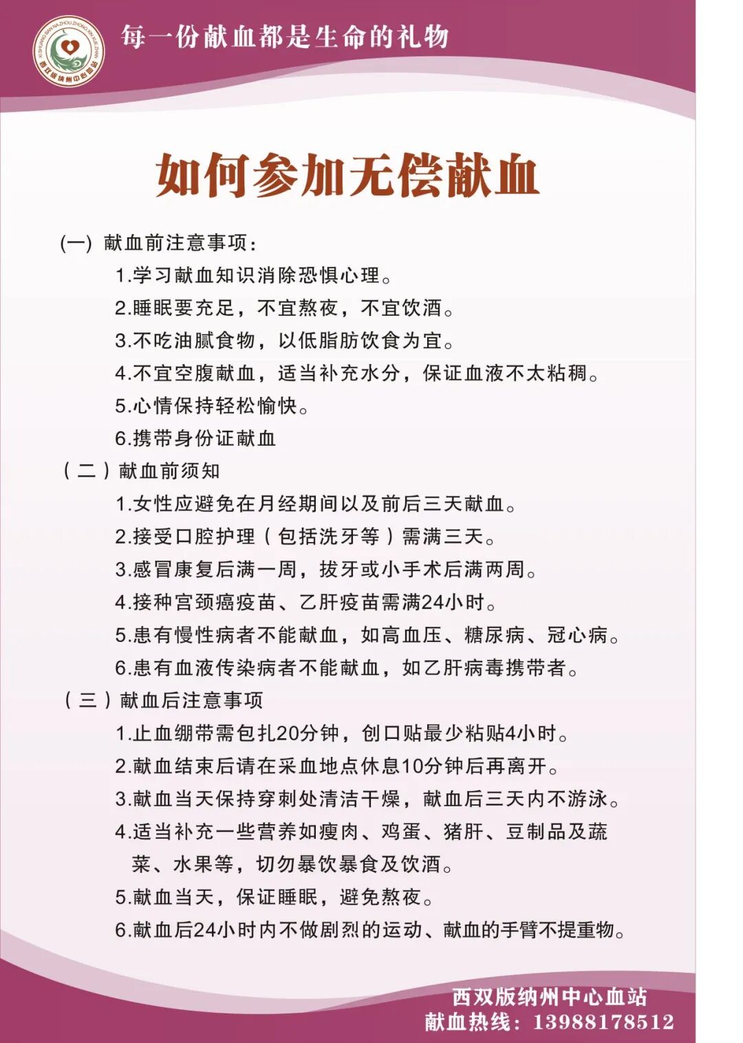 地址:西双版纳州中心血站(景洪市勐海路93号)