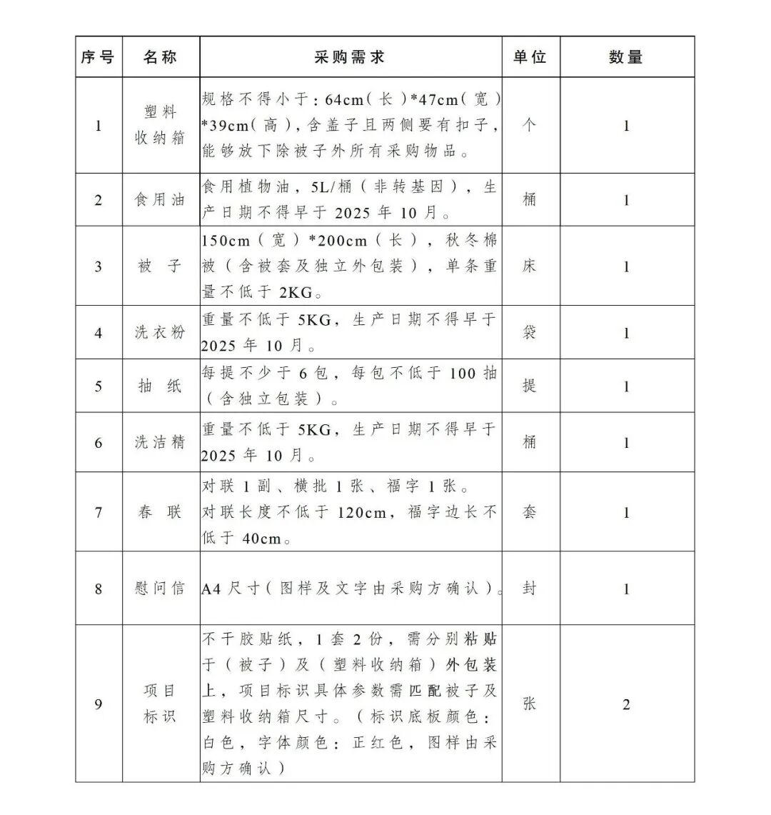根据2025年“58”“99公益”互联网筹款“博爱西双版纳行”项目安排,西双版纳州红十字会需采购一批春节送温暖家庭包,按照有关规定,现就采购项目进行公开询价,欢迎合格的供应商参加报价。(一)项目名称:博爱西双版纳行——春节送温暖家庭包(三)春节送温暖家庭包标准:单价上限300元/个,包含以下物品:(四)项目预算:计划采购1556个家庭包,总预算466800元,具体采购数量按照最终中标价确定。配送费用包括在货物总价款内,其中配送到景洪市937个(州级红会441个,景洪市红会496),配送到勐海县355个,配送到勐腊县264个。(一)符合《中华人民共和国政府采购法》第二十二条规定。需提供身份证明材料;(三)如为代理商投标,则供应商应出具所投产品制造厂家售后服务承诺书。装订成册封面加盖公章,侧面加盖骑缝章,用文件袋密封,文件袋上加盖骑缝章。报价文件递交后不予退回。(三)报价截止时间:2025年12月30日18:00(四)其他相关要求:递交报价文件时需同时提供实物样品1套,询价结束后30个工作日内由报价方自行领回,逾期未领取的,视为报价方同意州红十字会用于州内人道救助。(二)地点:西双版纳州红十字会(景洪市宣慰大道67号景咏办公大楼506室)