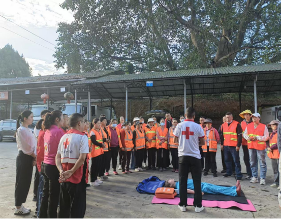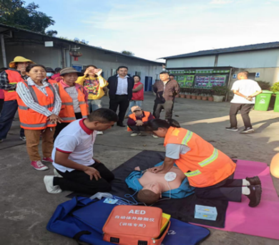 全体参加人员首先到盈江县环卫站集合,开展了针对性强、实用性高的应急救护知识培训。县红十字会培训师资围绕心肺复苏(CPR)实操、自动体外除颤器(AED)使用方法、创伤包扎止血等内容进行了细致讲解与示范,并指导环卫工人和参加活动党员实际操作CPR,有效提升了参训人员在面对突发状况时的自救互救能力,为一线作业安全增添了一道坚实防线。培训结束后,现场举行了慰问仪式,向环卫工人代表发放了秋季慰问品,传递了党和政府以及工会组织的温暖与关怀。随后,进行“感受环卫工人的一天”活动,党员跟随环卫工人走上街头,开展清扫、垃圾收集等清洁工作,体验环卫工作的艰辛与不易,在劳动实践中深刻体会“劳动最光荣”,筑牢全心全意为人民服务的思想根基。
