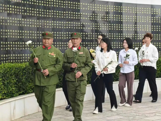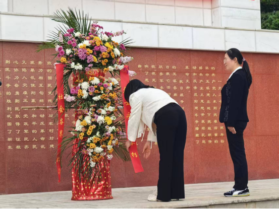 在深情的《献花曲》中,退伍老兵稳稳抬起花篮,缓步走向纪念碑,将花篮摆放在纪念碑基座上。群团联盟领导代表上前仔细整理花篮缎带,全体人员向烈士纪念碑行三鞠躬礼,表达对革命先辈的深切缅怀和继承遗志的坚定决心。