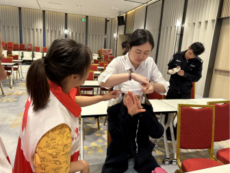 在创伤救护实践操作中,展示了头部、膝部、手臂等不同部位的止血、包扎、骨折处理及搬运的方法,随后让学员们两两一组分别进行练习,进一步提高了学员们的急救技能熟练程度,在“你教,我学”的互动模式下,学员们积极踊跃参与到操作中,现场气氛十分活跃。