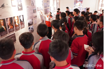 在红十字会讲解员的带领下,学生们走进人道文化传播中心。从索尔费里诺战场上的“一束光”到新时代中国的“红十字方阵”,通过一张张感人的战地照片,一个个鲜活的历史故事,讲解员对国际红十字运动的起源、中国红十字会的发展历程以及在“救灾、救护、救助”工作中的突出贡献娓娓道来,让学生们对红十字会有了更直观的认识。
