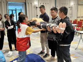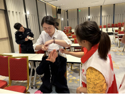 在创伤救护实践操作中,展示了头部、膝部、手臂等不同部位的止血、包扎、骨折处理及搬运的方法,随后让学员们两两一组分别进行练习,进一步提高了学员们的急救技能熟练程度,在“你教,我学”的互动模式下,学员们积极踊跃参与到操作中,现场气氛十分活跃。