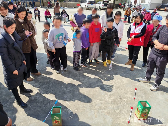 活动中,县红十字会志愿者首先为现场群众及村“两委”干部进行了海姆立克急救法、心肺复苏(CPR)等应急救护知识实操培训,提升大家的自救互救能力。随后,邀请孩子们参与了蒙眼敲锣、投壶、筷子夹乒乓球等趣味游戏,现场欢声笑语不断,气氛温馨融洽。