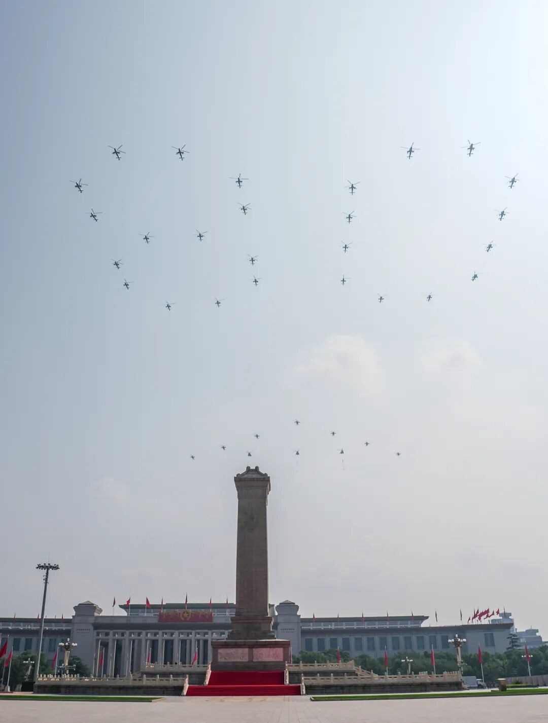 这是空中护旗梯队通过天安门广场,3架直-8L运输直升机分别悬挂“正义必胜”“和平必胜”“人民必胜”条幅。新华社记者 李钢 摄