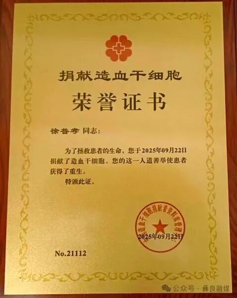 在经过严格的高分辨配型和体检后,他已于近日赴昆明完成捐献。“能通过这种方式帮助一个生命、一个家庭,我觉得非常有意义。”徐普孝在捐献后表示。