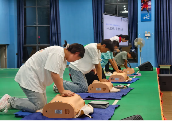 在随后的实操环节中,县红十字会工作人员向学生分发了应急救护知识宣传资料,并借助人体模型,逐步演示和讲解了心肺复苏、海姆立克急救法的规范操作,包括胸外按压位置、开放气道手法、人工呼吸节奏等操作要领,同时介绍了AED(自动体外除颤仪)的基本使用方法。同学们积极参与,在模型上亲自操作练习,通过实践掌握急救技能。