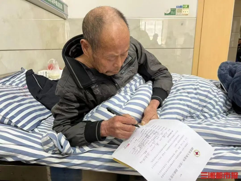 ▲刘正昌老人在病床上签署捐献同意书